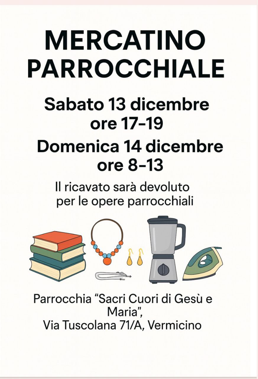 Con il gruppo parrocchiale che si occupa di attività caritative abbiamo anche realizzato un mercatino parrocchiale il 30 marzo 2025, il cui ricavato è stato destinato ai bisogni di parrocchiani e alla diocesi di Homs in Siria (aiuto questo promosso dallo stesso vescovo), nonché una raccolta alimentare presso il Conad il 21 giugno 2025, il cui ricavato è andato in parte alla parrocchia, in parte alle suore dell'Incarnazione ed in parte all'Emporio Caritas della diocesi di Frascati;